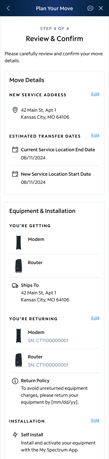 At a glance, the user now knows where their service is being moved, when their service is ending in their current location and starting at the new location, what equipment is coming to their new location, and what equipment has to be returned.
