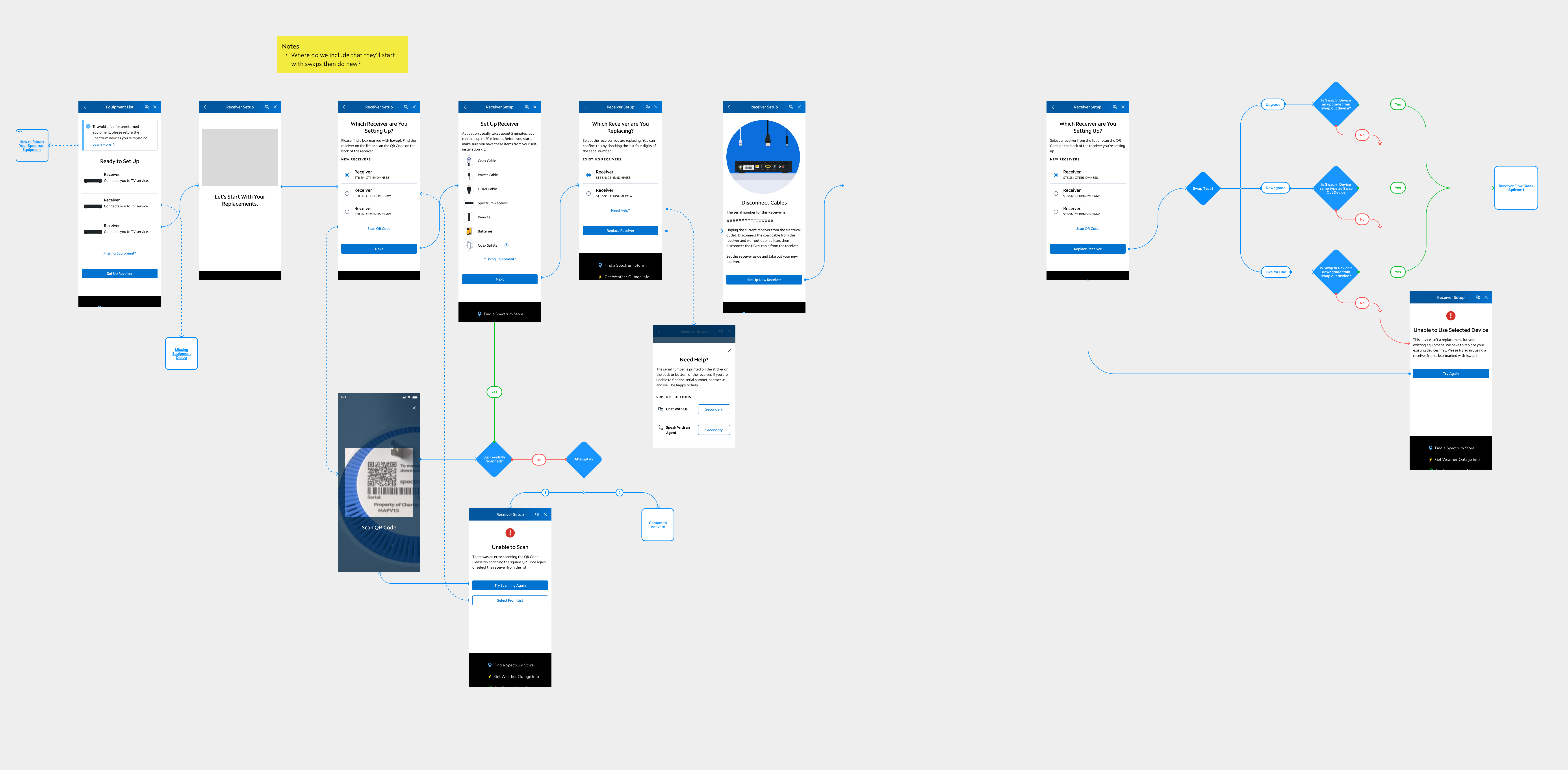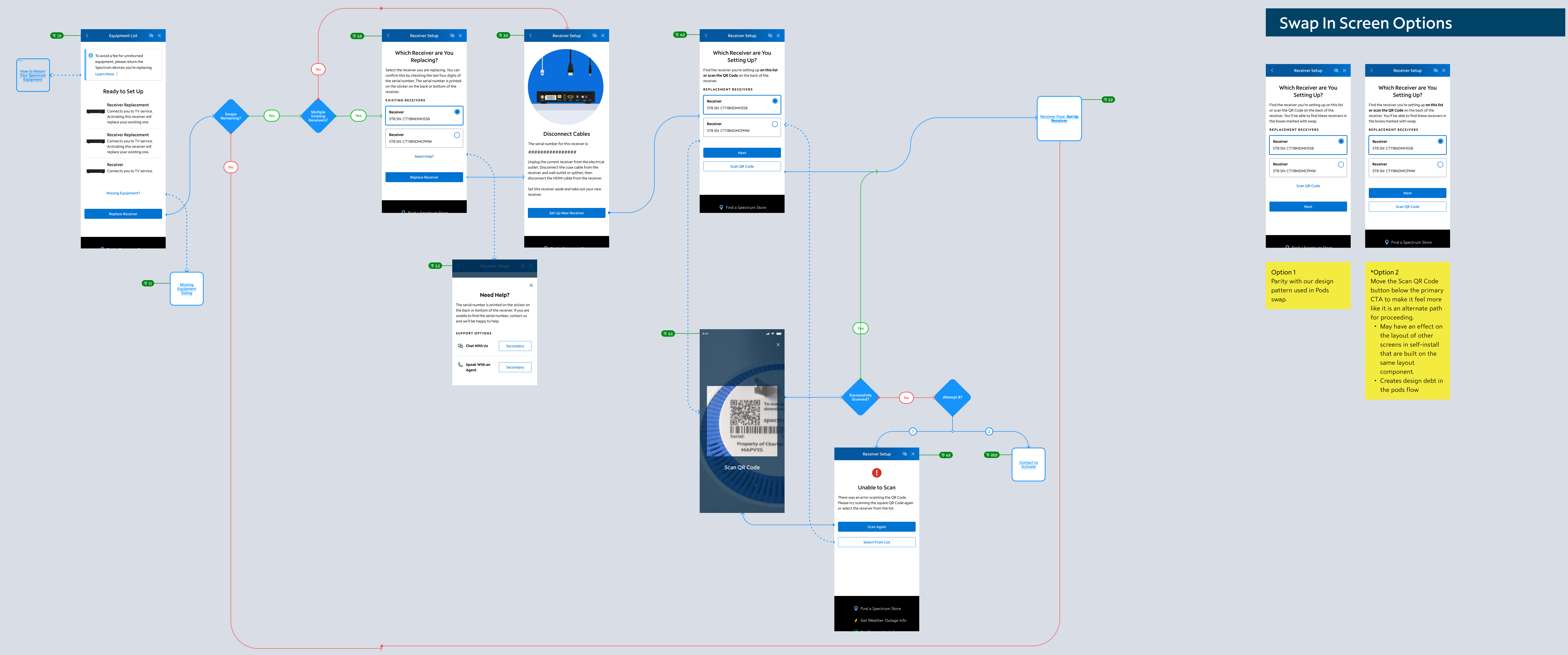 Forth, the user is able to select which receiver they’re setting up. All newer models of receiver have a QR code, so the flow able to provide a scanner. In the future, when Spectrum has more models produced post-2016 in circulation, this QR code scanner will be added to the screen where the user selects which receiver they’re replacing.